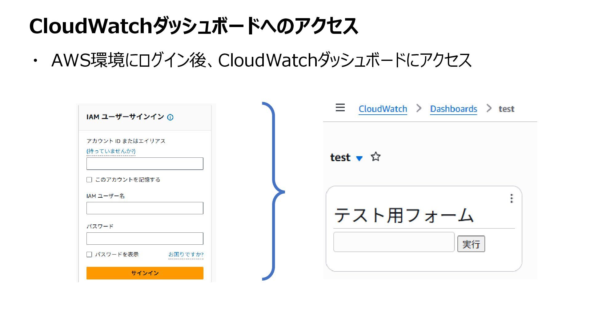 CloudWatchダッシュボードへのアクセス ・ AWS環境にログイン後、CloudWatchダッシュボードにアクセス