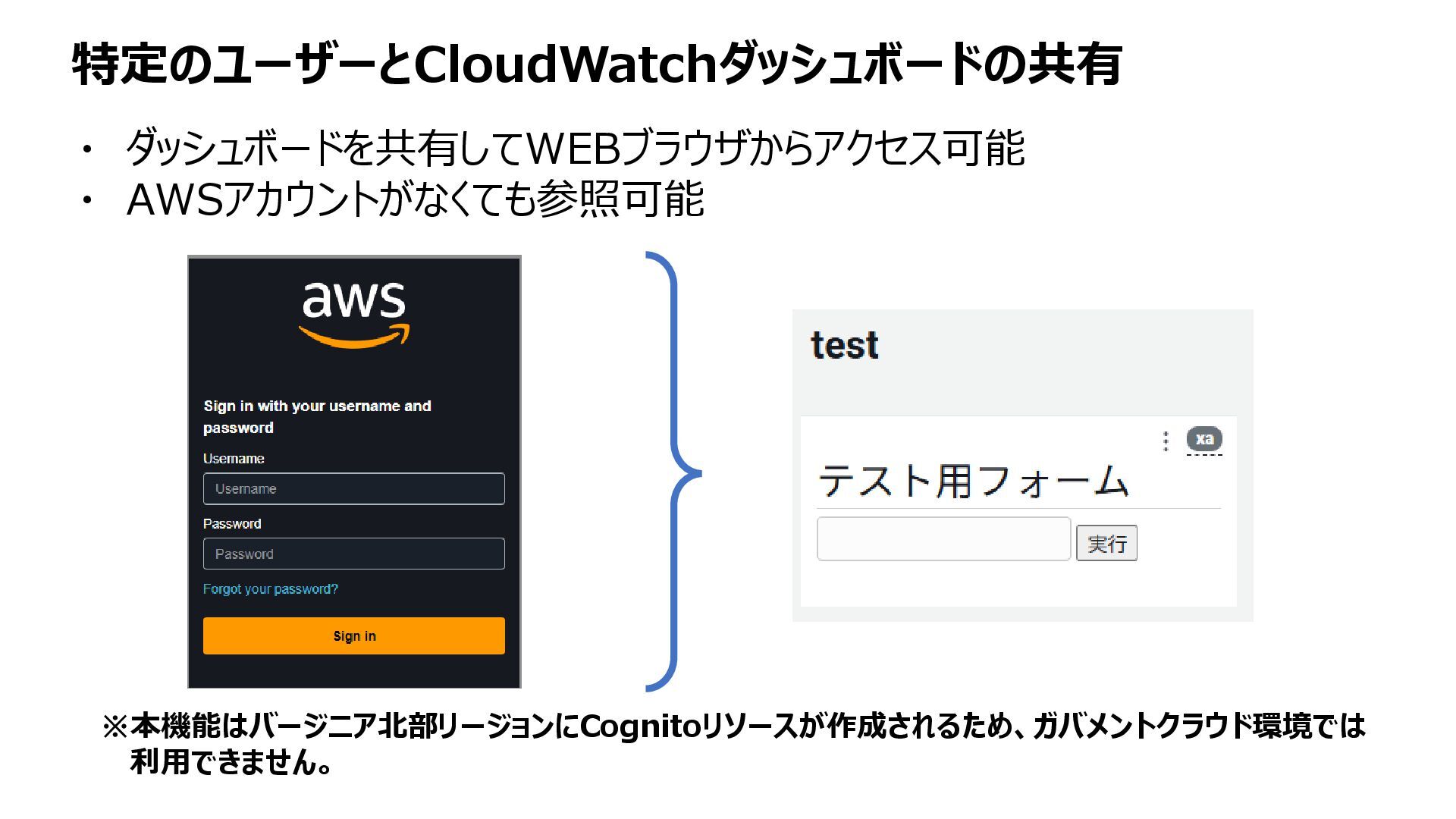 特定のユーザーとCloudWatchダッシュボードの共有 ※本機能はバージニア北部リージョンにCognitoリソースが作成されるため、ガバメントクラウド環境では 利用できません。 ・ ダッシュボードを共有してWEBブラウザからアクセス可能 ・ AWSアカウントがなくても参照可能
