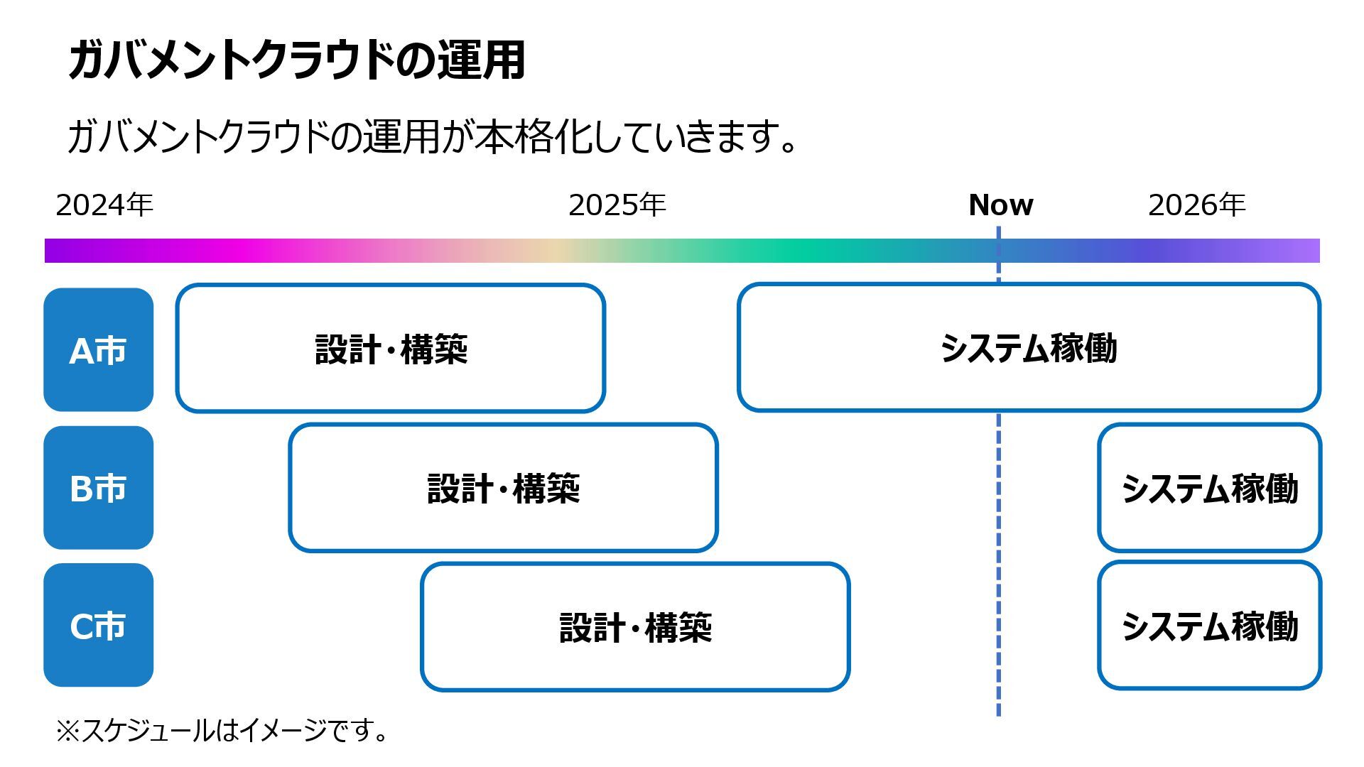 ガバメントクラウドの運用 ガバメントクラウドの運用が本格化していきます。 2024年 2025年 Now 2026年 設計・構築 設計・構築 設計・構築 システム稼働