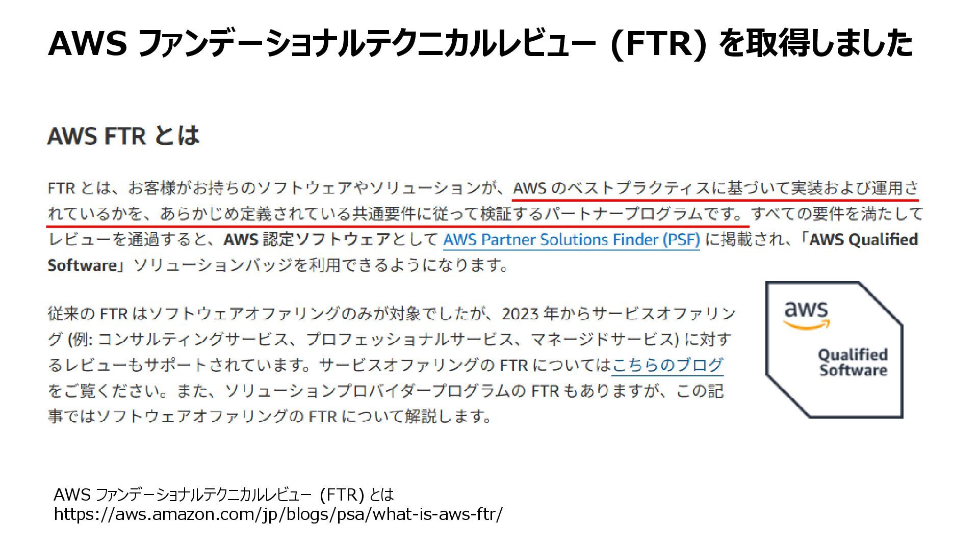 AWS ファンデーショナルテクニカルレビュー (FTR) を取得しました AWS ファンデーショナルテクニカルレビュー (FTR) とは https://aws.amazon.com/jp/blogs/psa/what-is-aws-ftr/