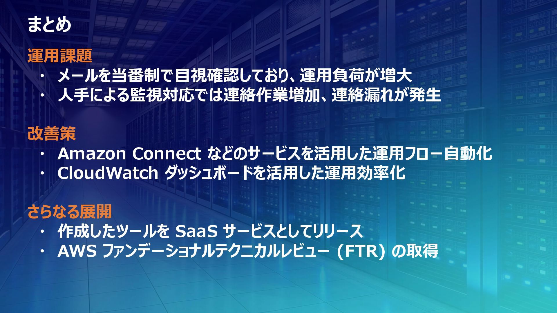 まとめ 運用課題 ・ メールを当番制で目視確認しており、運用負荷が増大 ・ 人手による監視対応では連絡作業増加、連絡漏れが発生 改善策 ・ Amazon Connect