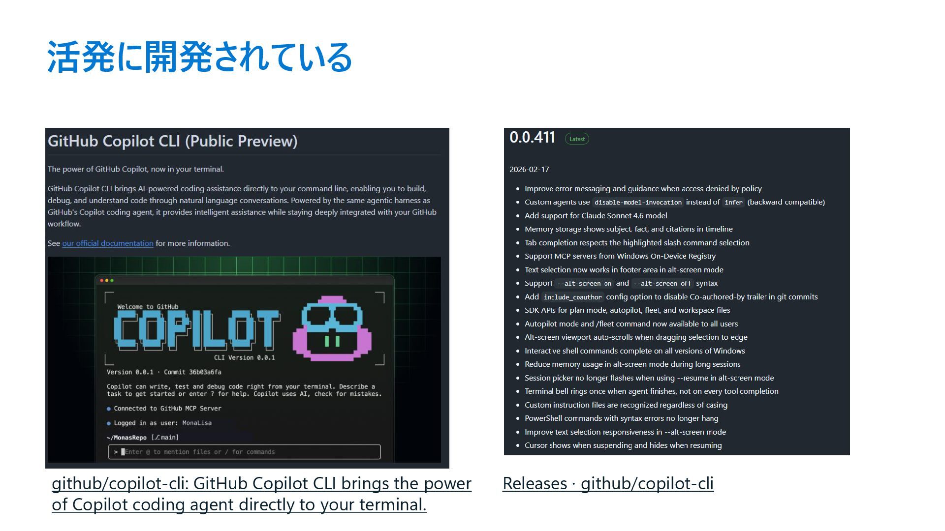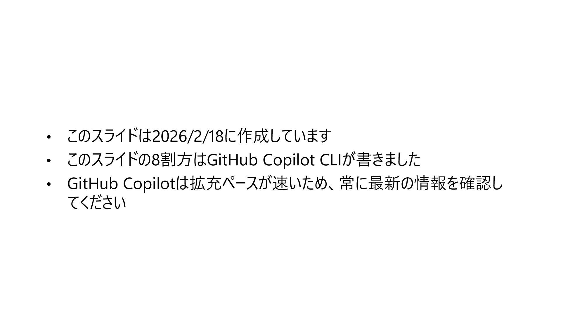 • このスライドは2026/2/18に作成しています • このスライドの8割方はGitHub Copilot CLIが書きました • GitHub Copilotは拡充ペースが速いため、常に最新の情報を確認し てください