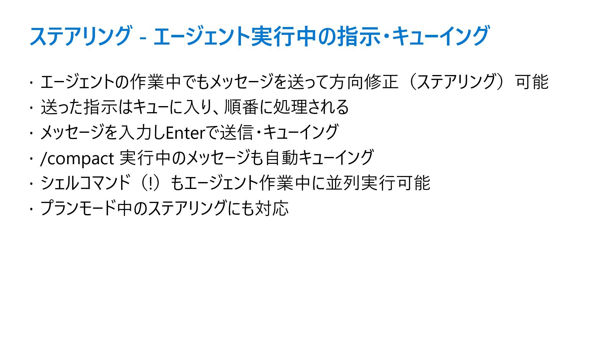 ステアリング - エージェント実行中の指示・キューイング エージェントの作業中でもメッセージを送って方向修正(ステアリング)可能 送った指示はキューに入り、順番に処理される メッセージを入力しEnterで送信・キューイング