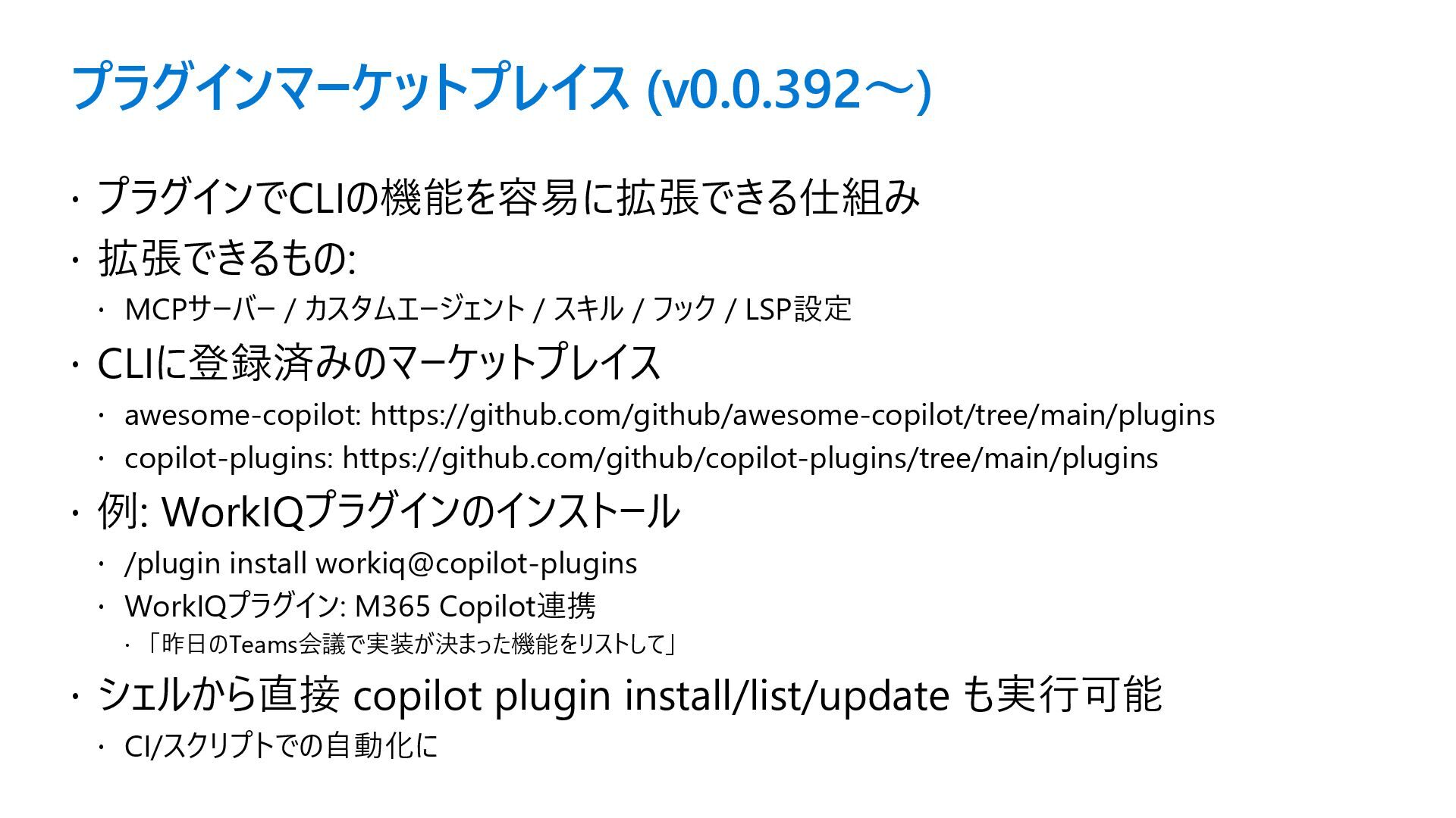 / スキル / フック / LSP設定 CLIに登録済みのマーケットプレイス awesome-copilot: https://github.com/github/awesome-copilot/tree/main/plugins copilot-plugins: https://github.com/github/copilot-plugins/tree/main/plugins 例: WorkIQプラグインのインストール /plugin install workiq@copilot-plugins WorkIQプラグイン: M365 Copilot連携 「昨日のTeams会議で実装が決まった機能をリストして」 シェルから直接 copilot plugin install/list/update も実行可能 CI/スクリプトでの自動化に