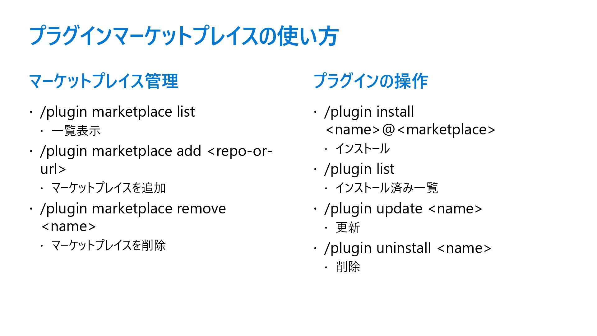 marketplace add <repo-or- url> マーケットプレイスを追加 /plugin marketplace remove <name> マーケットプレイスを削除 プラグインの操作 /plugin install <name>@<marketplace> インストール /plugin list インストール済み一覧 /plugin update <name> 更新 /plugin uninstall <name> 削除