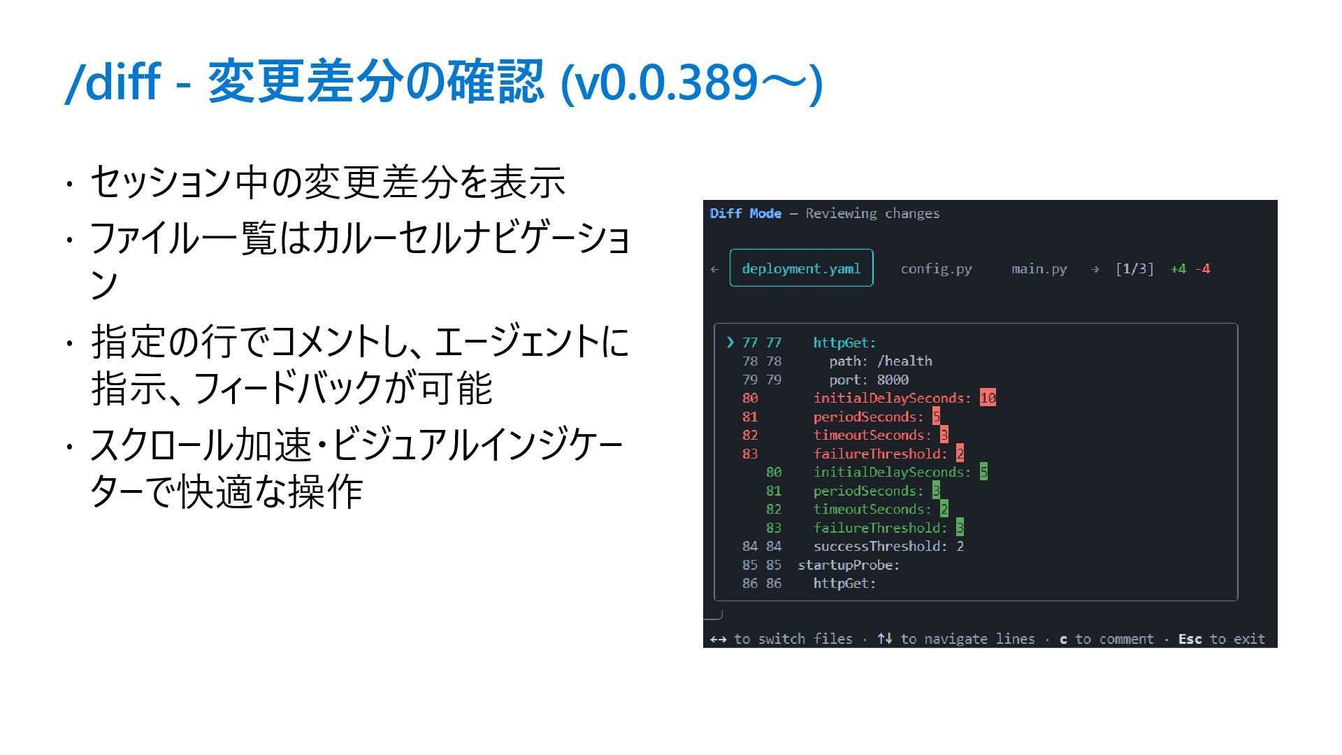 /diff - 変更差分の確認 (v0.0.389〜) セッション中の変更差分を表示 ファイル一覧はカルーセルナビゲーショ ン