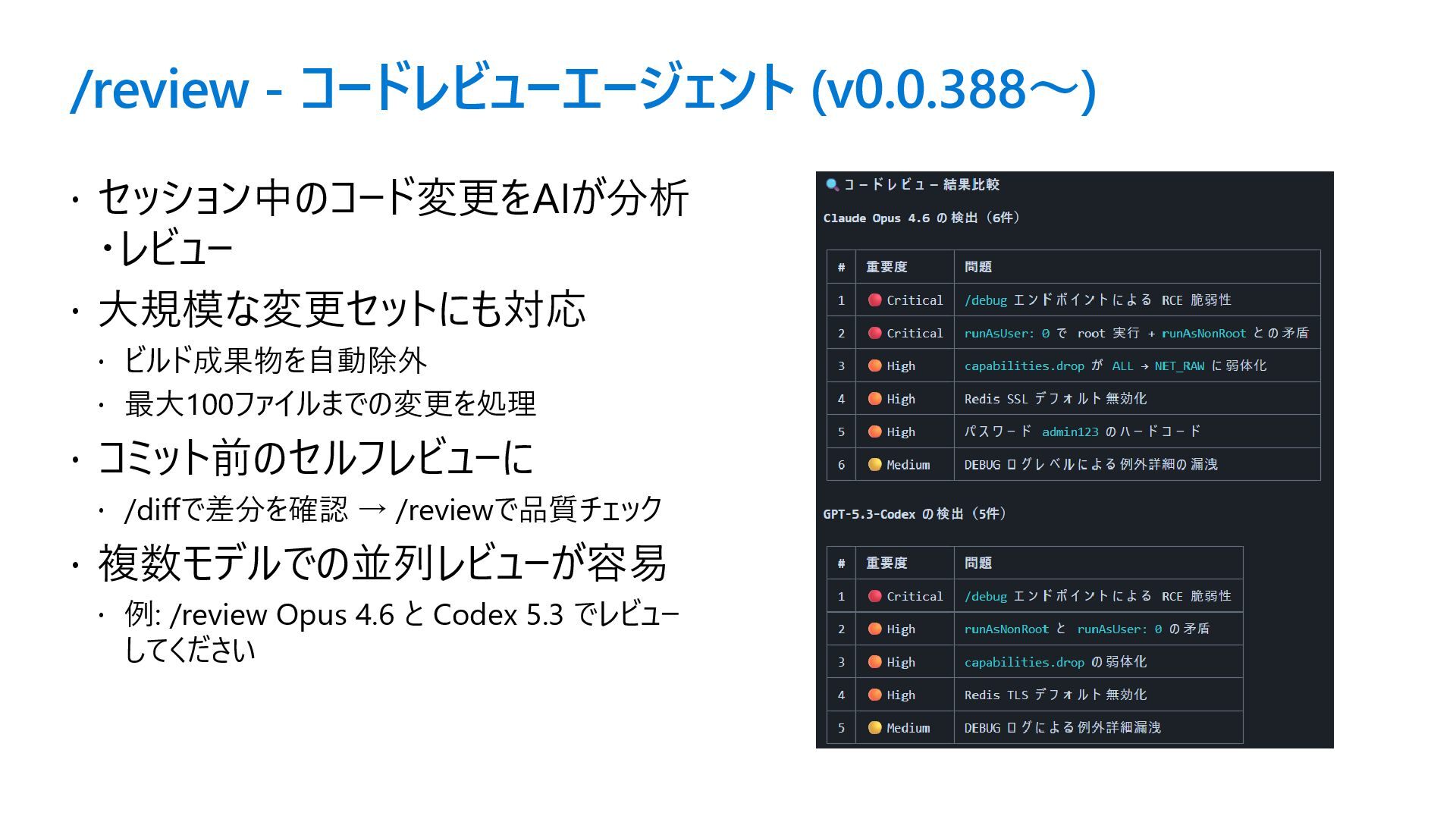 /review - コードレビューエージェント (v0.0.388〜) セッション中のコード変更をAIが分析 ・レビュー 大規模な変更セットにも対応