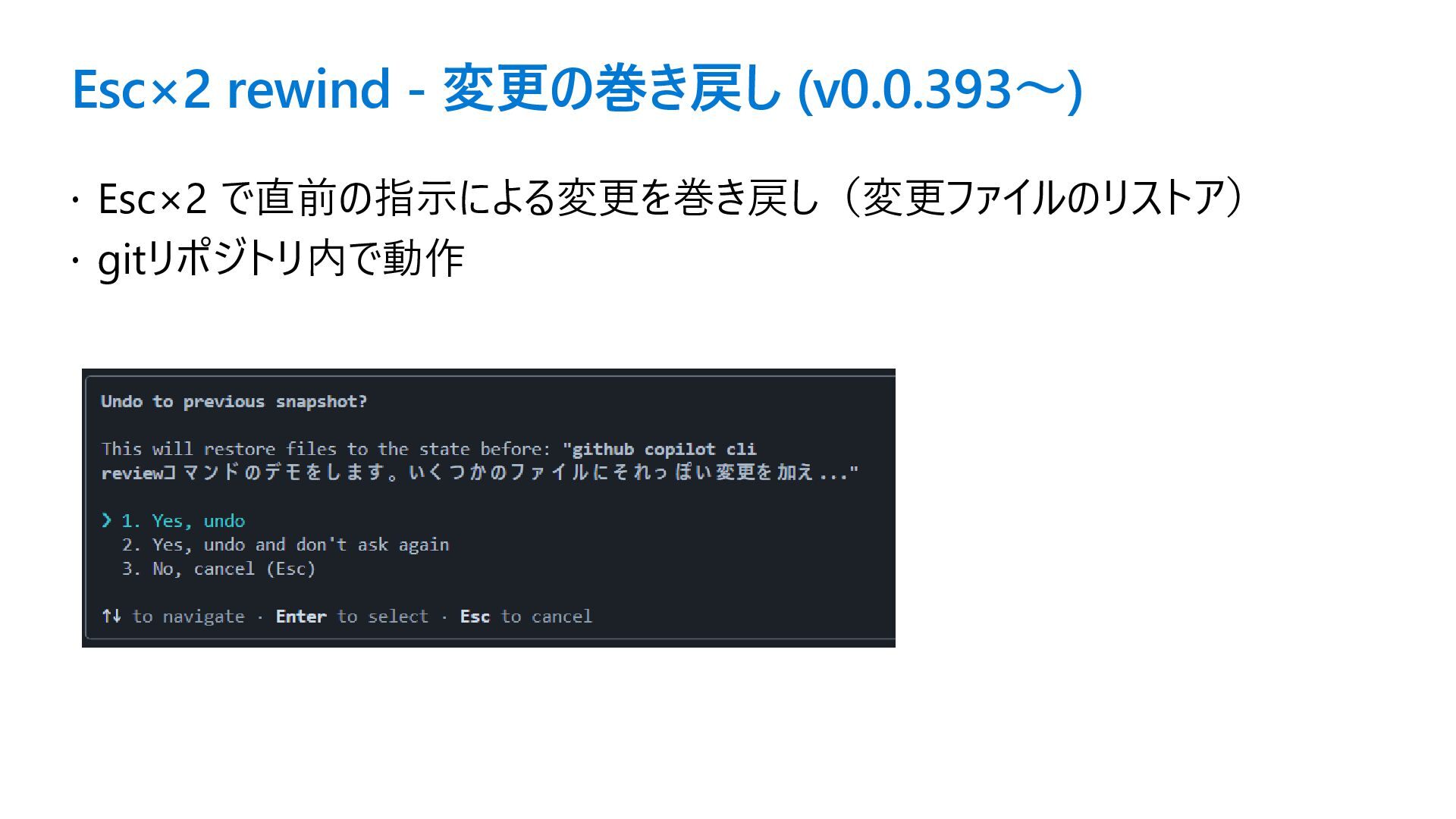 Esc×2 rewind - 変更の巻き戻し (v0.0.393〜) Esc×2 で直前の指示による変更を巻き戻し(変更ファイルのリストア) gitリポジトリ内で動作