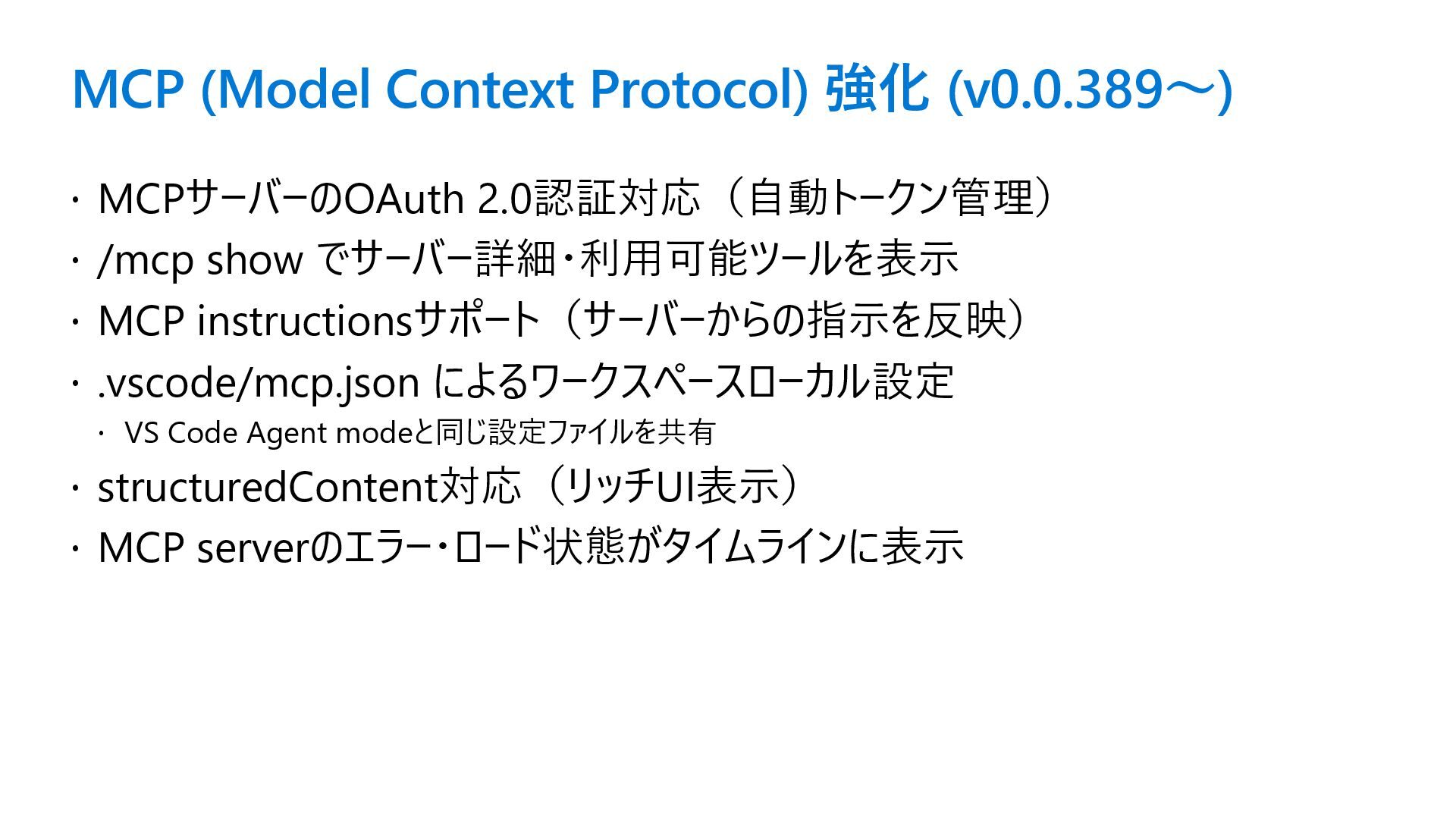 /mcp show でサーバー詳細・利用可能ツールを表示 MCP instructionsサポート(サーバーからの指示を反映) .vscode/mcp.json によるワークスペースローカル設定 VS Code Agent modeと同じ設定ファイルを共有 structuredContent対応(リッチUI表示) MCP serverのエラー・ロード状態がタイムラインに表示