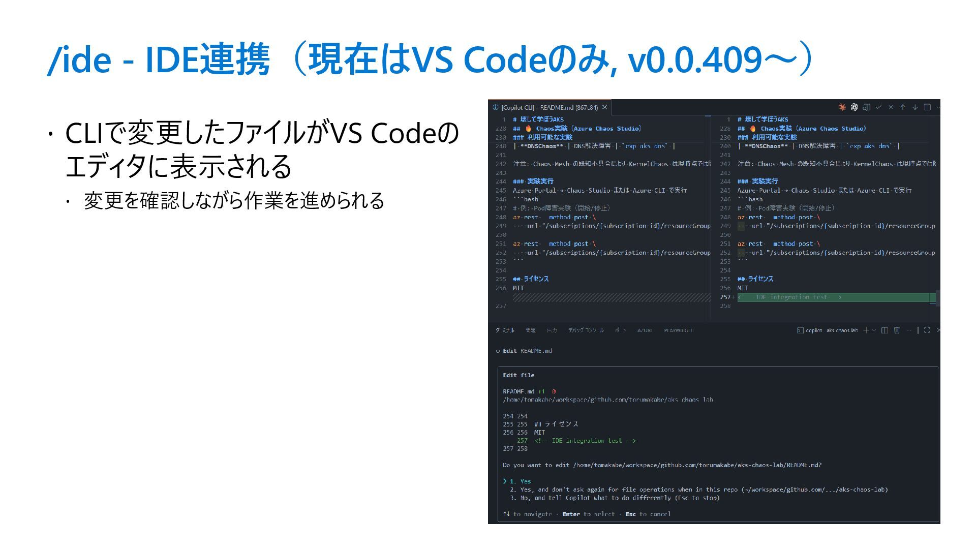 /ide - IDE連携(現在はVS Codeのみ, v0.0.409〜) CLIで変更したファイルがVS Codeの エディタに表示される