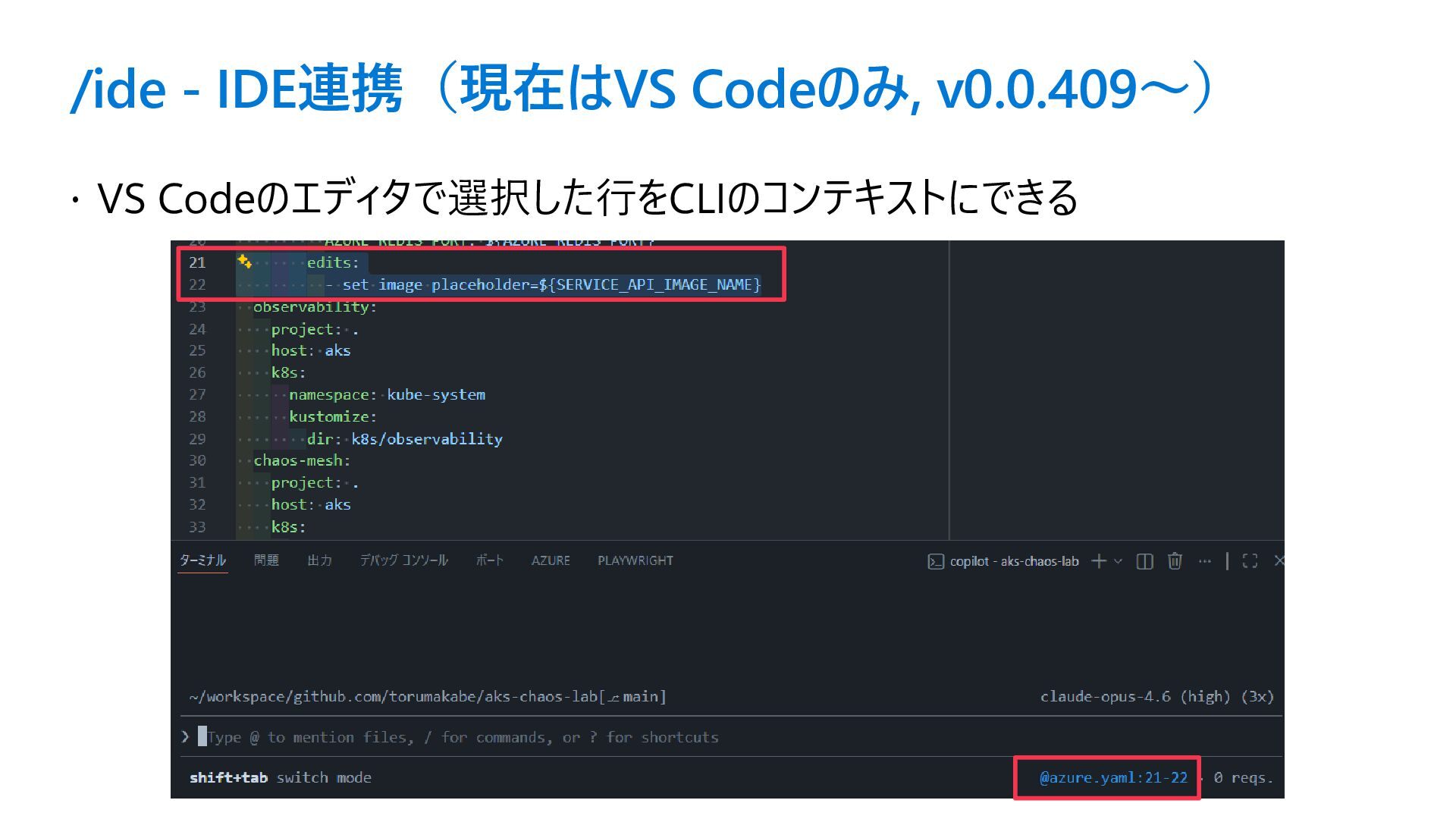 /ide - IDE連携(現在はVS Codeのみ, v0.0.409〜) VS Codeのエディタで選択した行をCLIのコンテキストにできる
