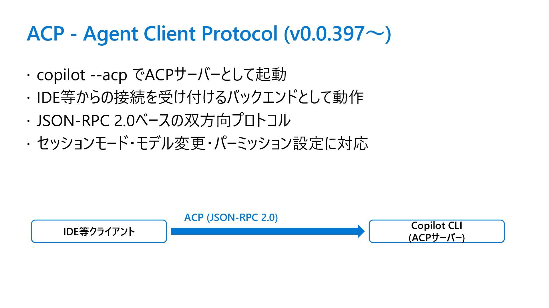 IDE等からの接続を受け付けるバックエンドとして動作 JSON-RPC 2.0ベースの双方向プロトコル セッションモード・モデル変更・パーミッション設定に対応 IDE等クライアント Copilot CLI (ACPサーバー) ACP (JSON-RPC 2.0)