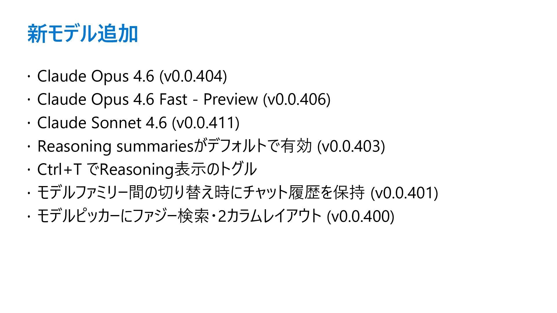 Fast - Preview (v0.0.406) Claude Sonnet 4.6 (v0.0.411) Reasoning summariesがデフォルトで有効 (v0.0.403) Ctrl+T でReasoning表示のトグル モデルファミリー間の切り替え時にチャット履歴を保持 (v0.0.401) モデルピッカーにファジー検索・2カラムレイアウト (v0.0.400)