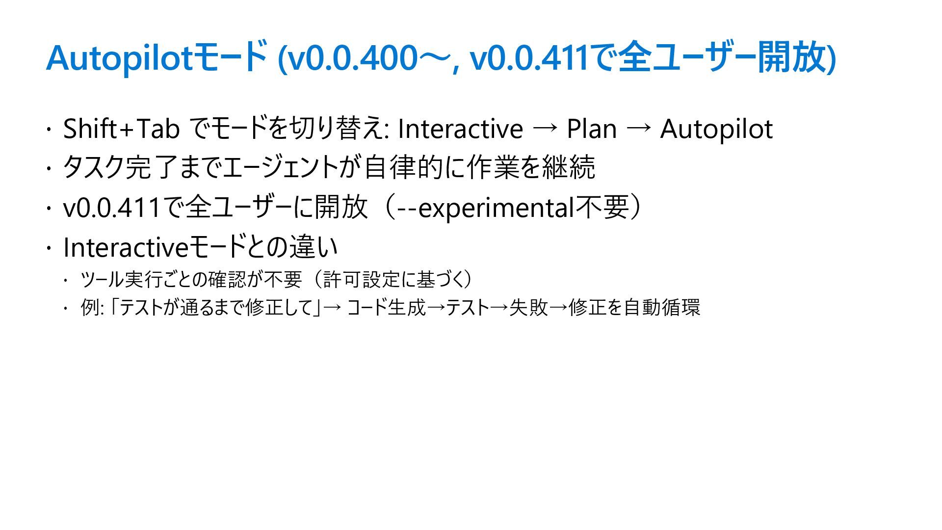 Autopilot タスク完了までエージェントが自律的に作業を継続 v0.0.411で全ユーザーに開放(--experimental不要) Interactiveモードとの違い ツール実行ごとの確認が不要(許可設定に基づく) 例: 「テストが通るまで修正して」→ コード生成→テスト→失敗→修正を自動循環