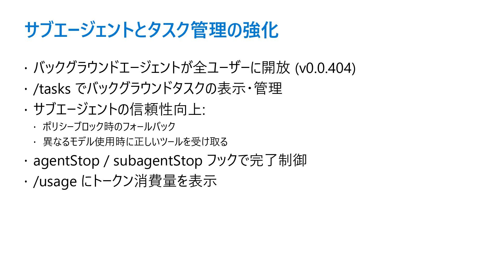 ポリシーブロック時のフォールバック 異なるモデル使用時に正しいツールを受け取る agentStop / subagentStop フックで完了制御 /usage にトークン消費量を表示