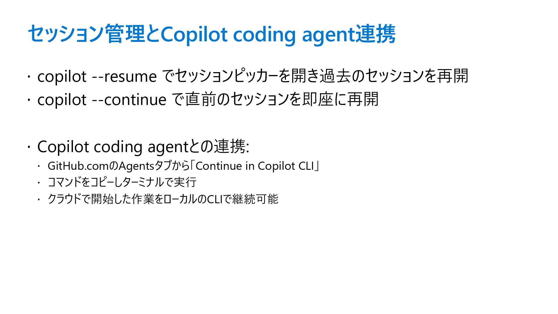セッション管理とCopilot coding agent連携 copilot --resume でセッションピッカーを開き過去のセッションを再開 copilot --continue