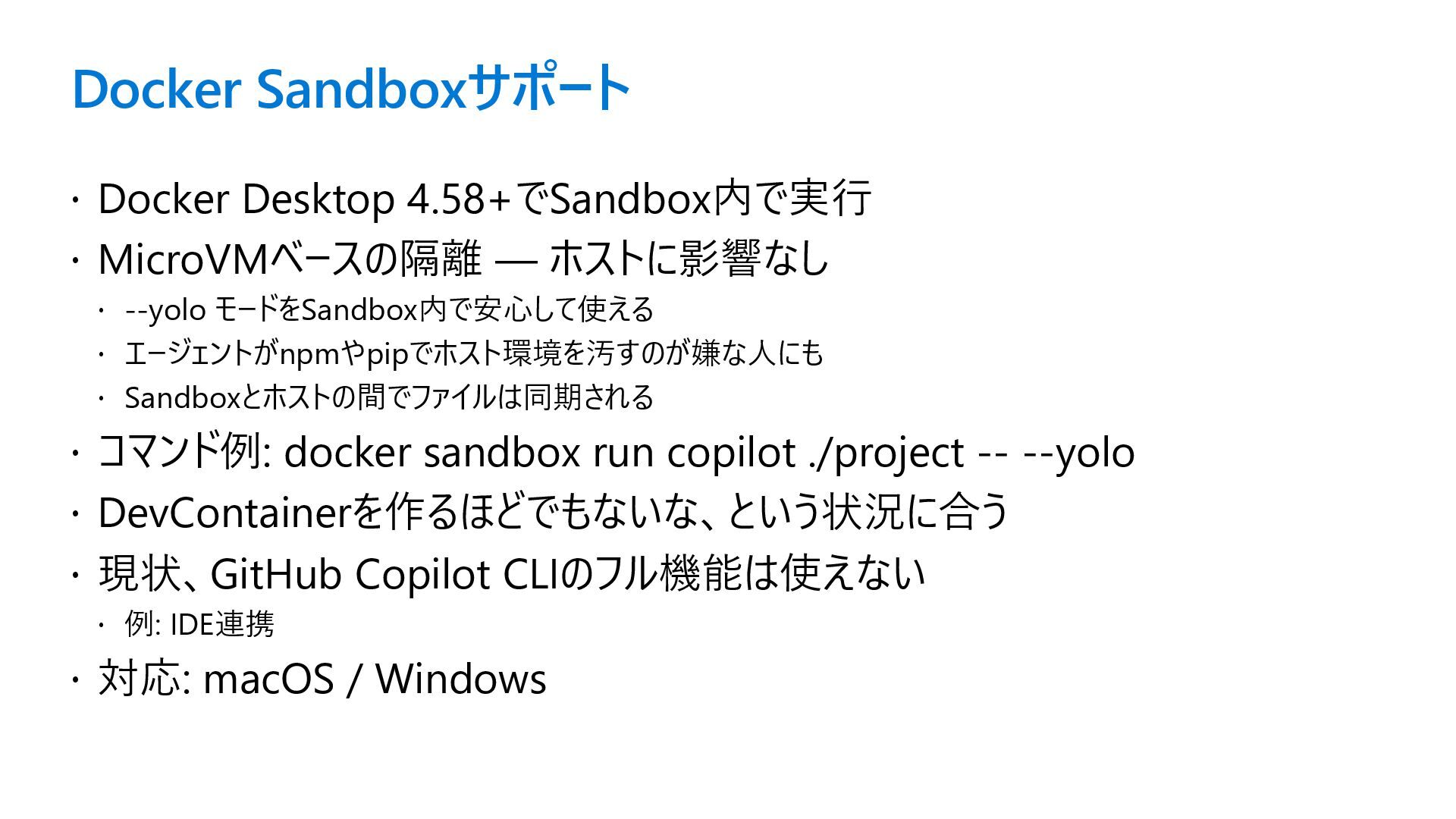--yolo モードをSandbox内で安心して使える エージェントがnpmやpipでホスト環境を汚すのが嫌な人にも Sandboxとホストの間でファイルは同期される コマンド例: docker sandbox run copilot ./project -- --yolo DevContainerを作るほどでもないな、という状況に合う 現状、GitHub Copilot CLIのフル機能は使えない 例: IDE連携 対応: macOS / Windows