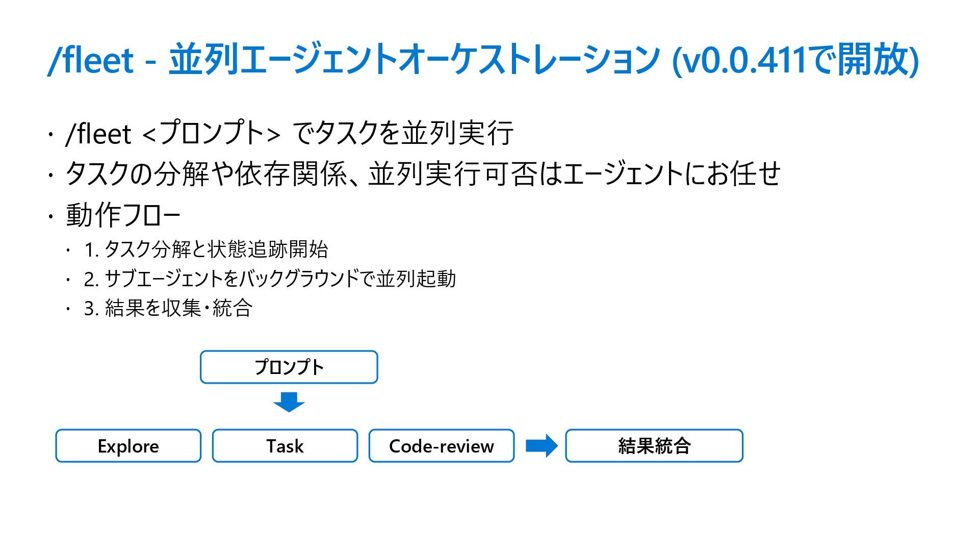 /fleet - 並列エージェントオーケストレーション (v0.0.411で開放) /fleet <プロンプト> でタスクを並列実行 タスクの分解や依存関係、並列実行可否はエージェントにお任せ