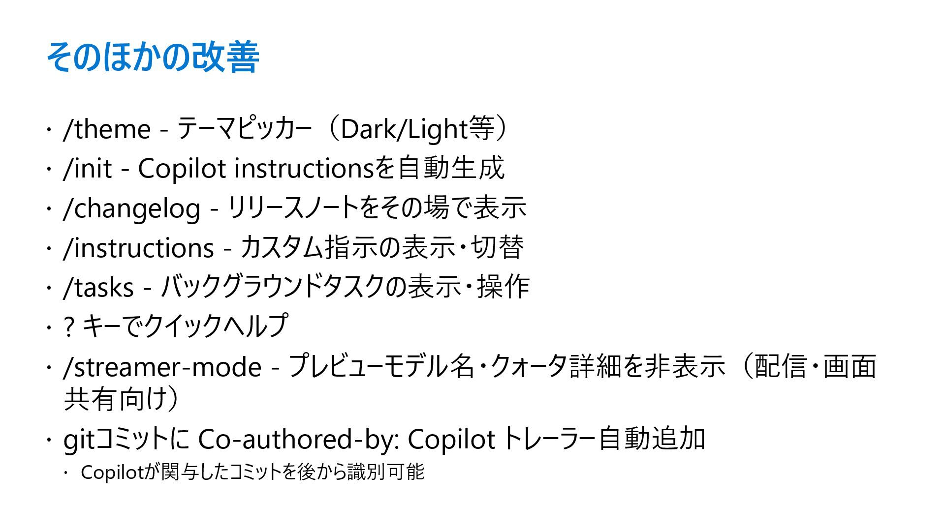 そのほかの改善 /theme - テーマピッカー(Dark/Light等) /init - Copilot instructionsを自動生成