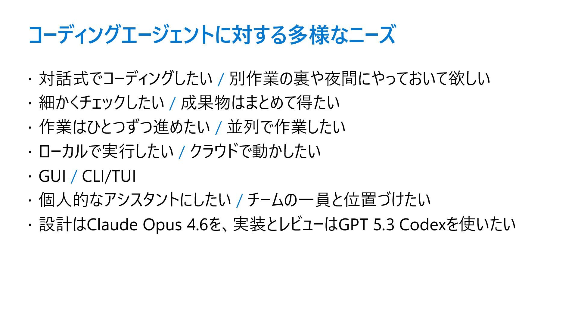 作業はひとつずつ進めたい / 並列で作業したい ローカルで実行したい / クラウドで動かしたい GUI / CLI/TUI 個人的なアシスタントにしたい / チームの一員と位置づけたい 設計はClaude Opus 4.6を、実装とレビューはGPT 5.3 Codexを使いたい