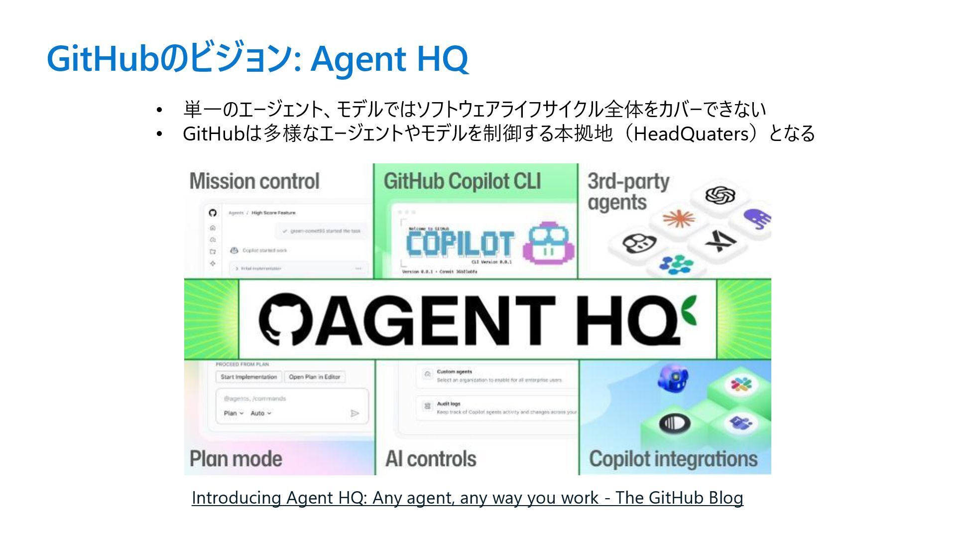 you work - The GitHub Blog • 単一のエージェント、モデルではソフトウェアライフサイクル全体をカバーできない • GitHubは多様なエージェントやモデルを制御する本拠地(HeadQuaters)となる