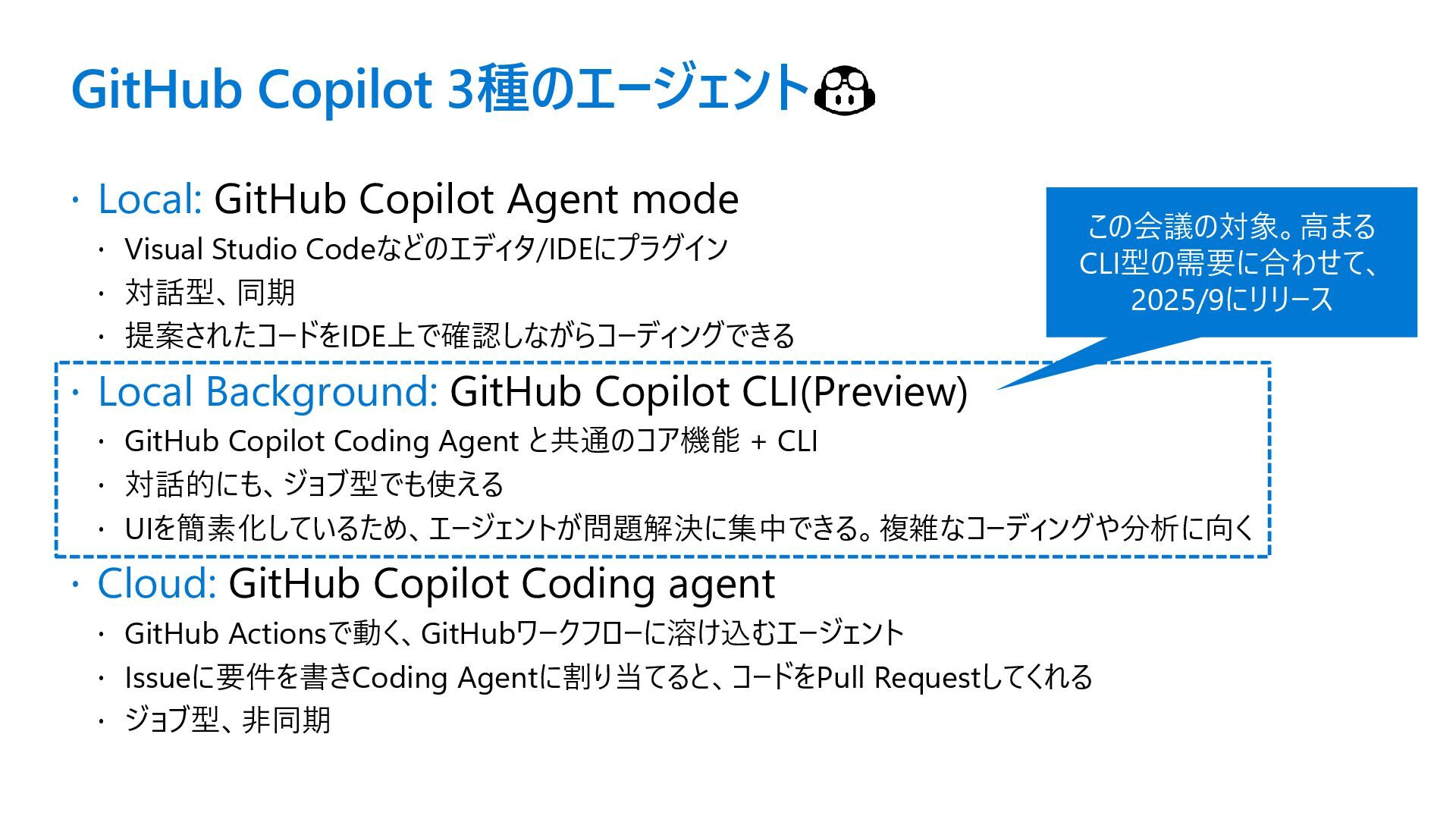 Visual Studio Codeなどのエディタ/IDEにプラグイン 対話型、同期 提案されたコードをIDE上で確認しながらコーディングできる Local Background: GitHub Copilot CLI(Preview) GitHub Copilot Coding Agent と共通のコア機能 + CLI 対話的にも、ジョブ型でも使える UIを簡素化しているため、エージェントが問題解決に集中できる。複雑なコーディングや分析に向く Cloud: GitHub Copilot Coding agent GitHub Actionsで動く、GitHubワークフローに溶け込むエージェント Issueに要件を書きCoding Agentに割り当てると、コードをPull Requestしてくれる ジョブ型、非同期 この会議の対象。高まる CLI型の需要に合わせて、 2025/9にリリース