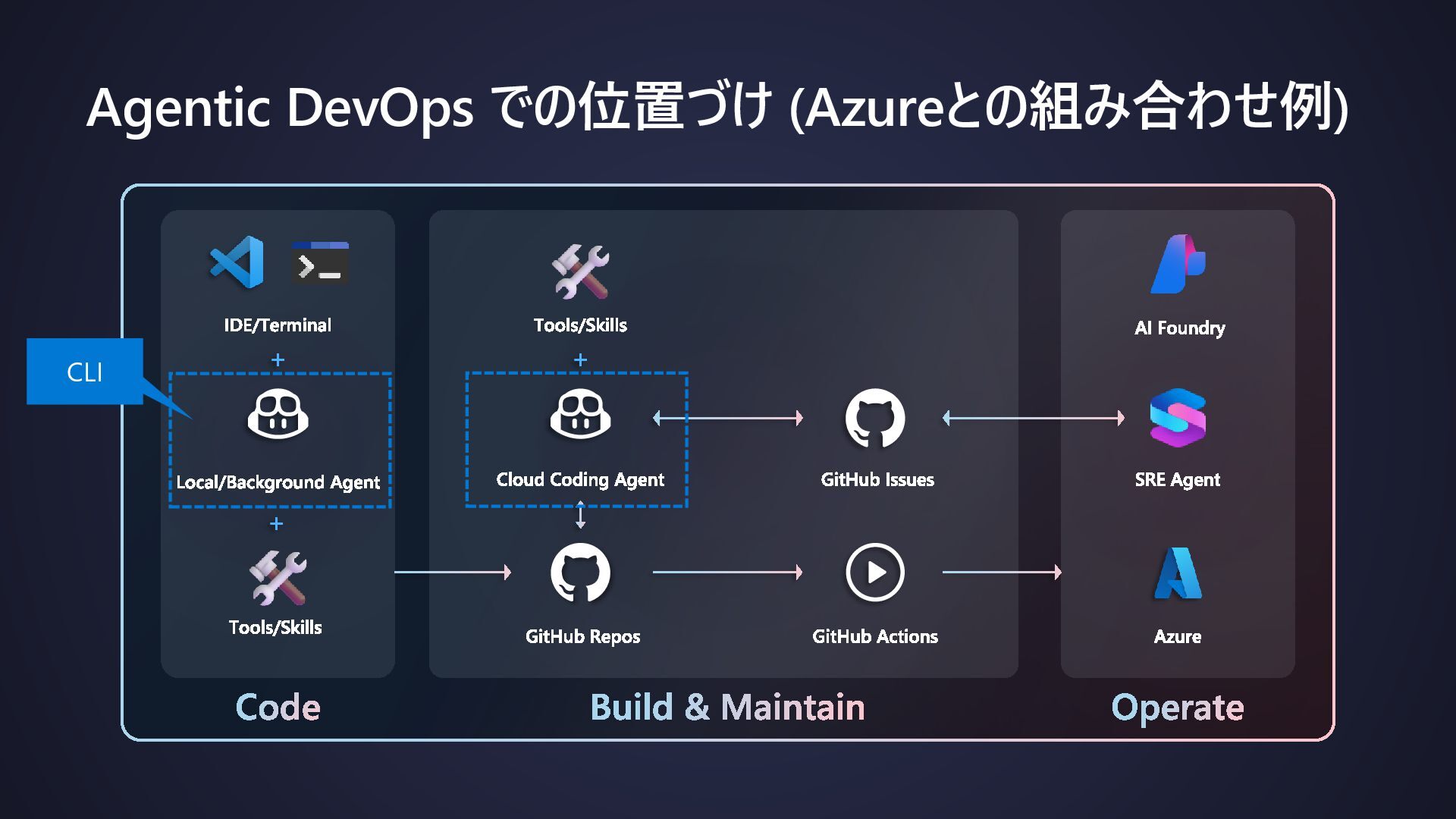 Agentic DevOps での位置づけ (Azureとの組み合わせ例) Code Build & Maintain Operate IDE/Terminal