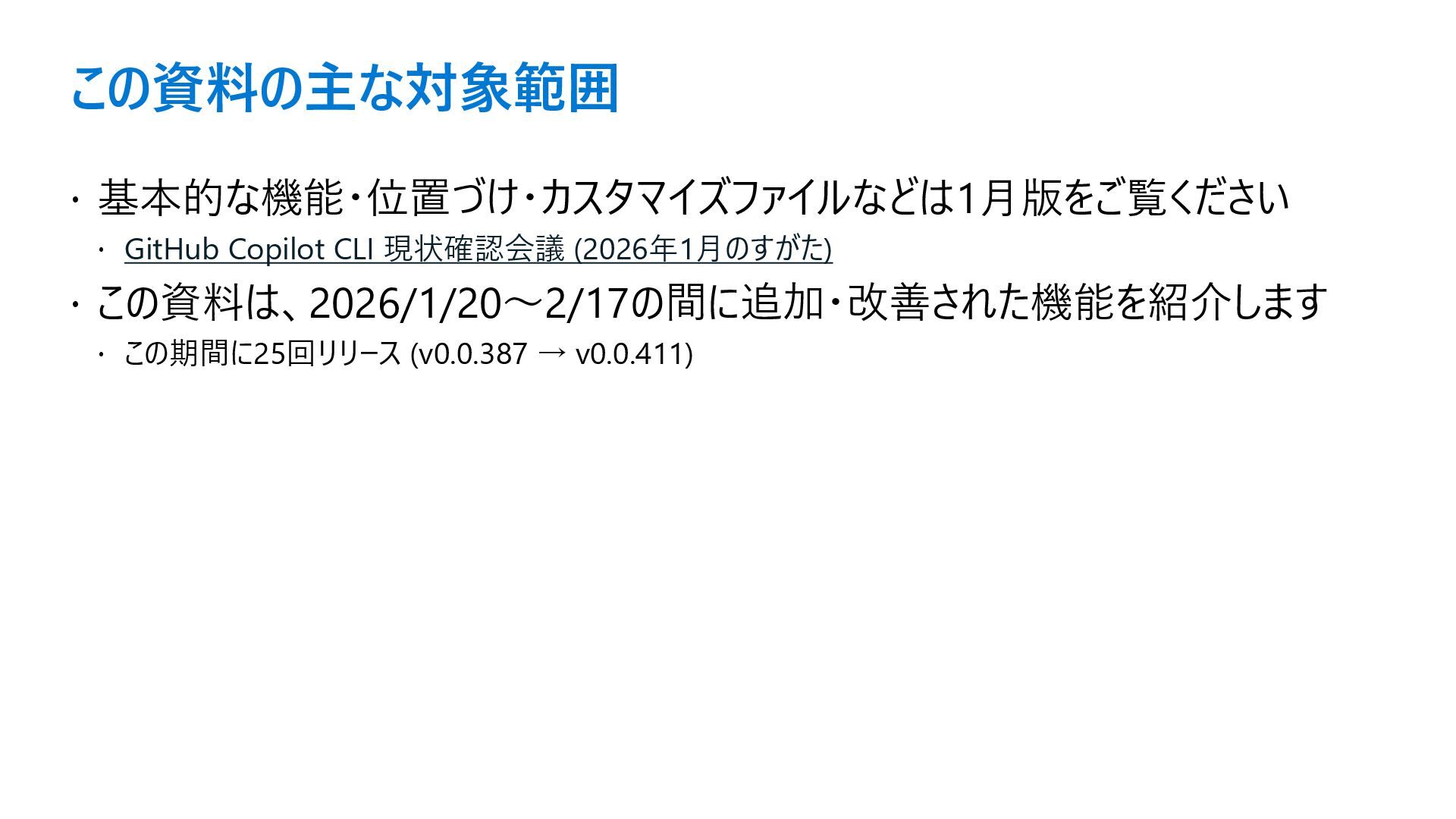 この資料の主な対象範囲 基本的な機能・位置づけ・カスタマイズファイルなどは1月版をご覧ください GitHub Copilot CLI 現状確認会議 (2026年1月のすがた)
