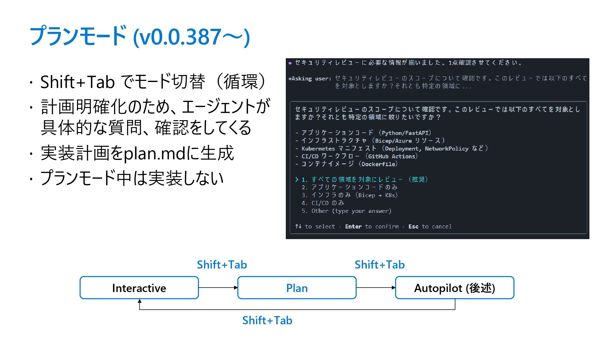 プランモード中は実装しない Interactive Plan Autopilot (後述) Shift+Tab Shift+Tab Shift+Tab