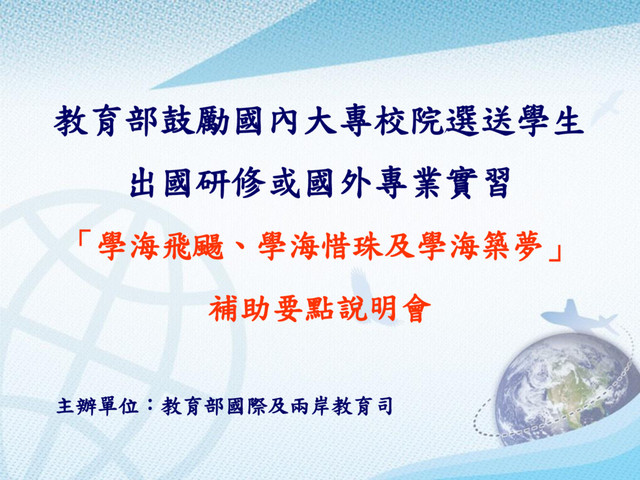 教育部鼓勵國內大專校院選送學生 出國研修或國外專業實習 「學海飛颺、學海惜珠及學海築夢」 補助要點說明會 主辦單位:教育部國際及兩岸教育司