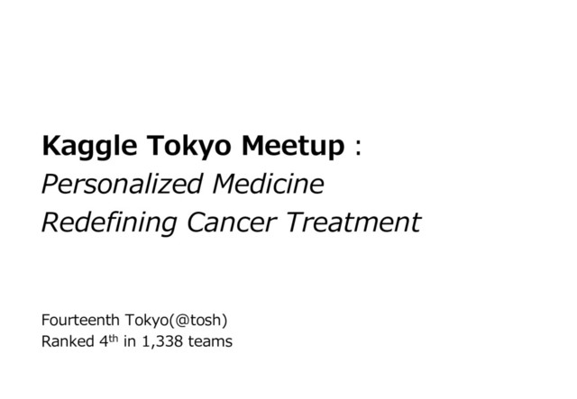 テストデータ: ü学習データ:3,322件 üテストデータ Phase1データ: 5669件 Phase2(最終評価)データ: 987件 ü内容: ü Gene:突然変異した細胞の場所 ü Variation:アミノ酸変化種別 ü Text:テキスト形式の臨床的エビデンス(約50,000⽂字) ü Class:病理診断の結果 2. 評価⽅法: 2 ID Gene Variation Text Class 0 FAM5 8A Truncatin g Mutation s Cyclin-dependent kinases (CDKs) regulate... 1 1 CBL W802* cell lung canc... 2