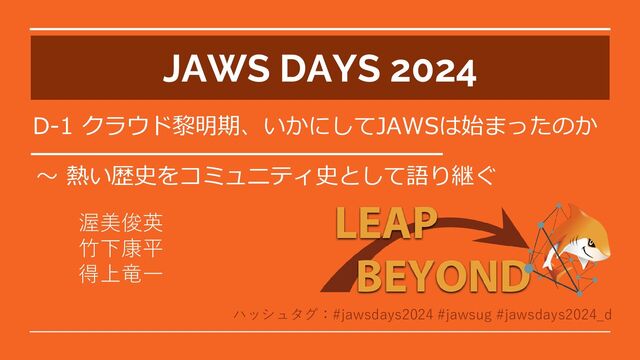 JAWS Days 2024 (2024/3/2) https://jawsdays2024.jaws-ug.jp/ クラウド黎明期、いかにしてJAWSは始まったのか ~熱い歴史をコミュニティ史として語り継ぐ 渥美俊英、竹下康平、得上竜一 https://jawsdays2024.jaws-ug.jp/sessions/timetable/D-6/