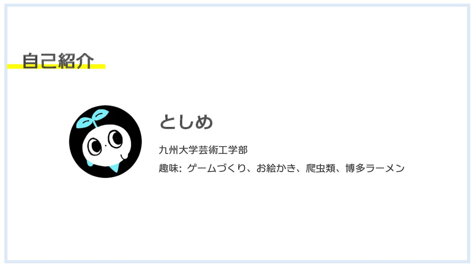 としめ 九州大学芸術工学部 趣味: ゲームづくり、お絵かき、爬虫類、博多ラーメン 自己紹介