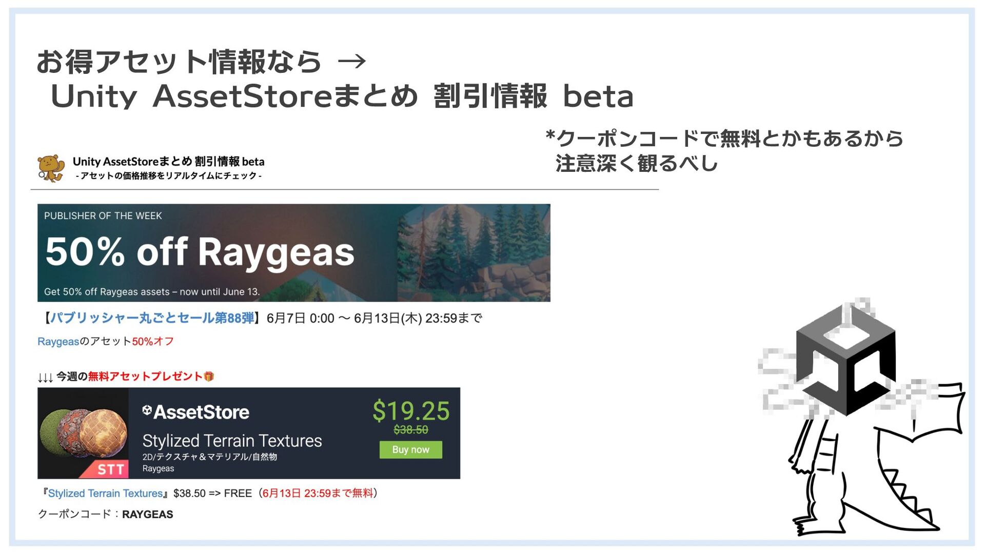 お得アセット情報なら → Unity AssetStoreまとめ 割引情報 beta *クーポンコードで無料とかもあるから 注意深く観るべし