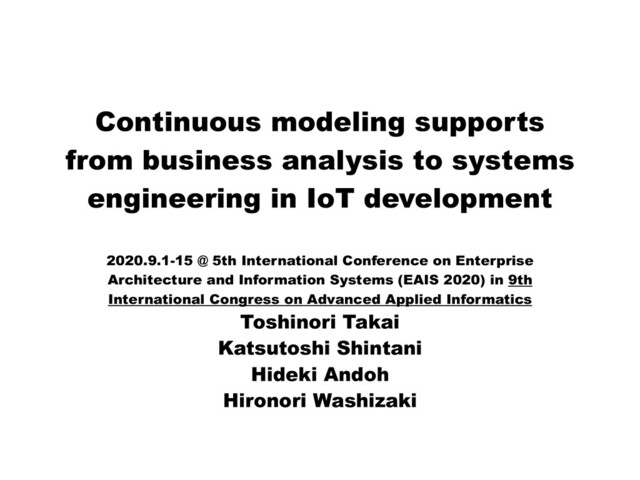 Developing Internet of Things(IoT) systems is non- trivial because diverse solution spaces must be simultaneously satisfied due to the intrinsic nature of IoT systems. To address this challenge, we proposed a method chain approach called the continuous modeling support process for business analysis and solution requirements in IoT development(COMP4BA-IoT) consisting of Business Analysis Body of Knowledge (BABOK), GQM+Strategies, GSN (goal structuring notation) and systems modeling language SysML.