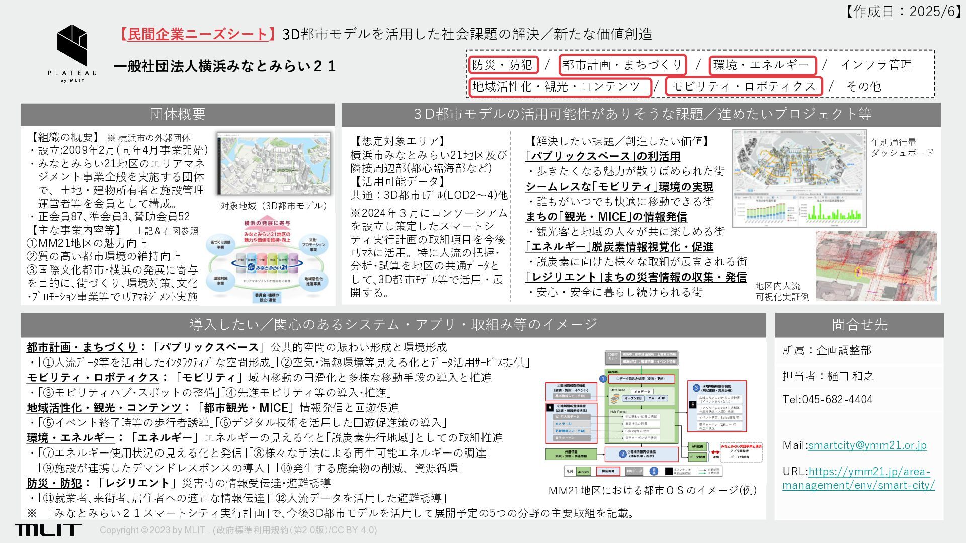 [email protected] 【民間企業ニーズシート】3D都市モデルを活用した社会課題の解決/新たな価値創造 (株)安藤・間(呼称:安藤ハザマ) 【会社の概要】 ものづくり(建設業)を中軸に 新たな価値を創造することで、 人びとが安心して快適に暮らせ るサステナブルな社会を実現し、 社会とともに成長する企業を目 指しています。 【主な事業内容等】 次の事業における企画、設計、 施工やコンサルティング業務 ・土木,建築,土壌浄化 ・地域開発,都市開発,環境整備 ・発電,エネルギー供給 ・建物の統合管理 など 防災・防犯 / 都市計画・まちづくり / 環境・エネルギー / インフラ管理 地域活性化・観光・コンテンツ / モビリティ・ロボティクス / その他 【作成日:2024/3/7】 問合せ先 団体概要 防災・防犯 河川やため池の堤防の強靭化対策に取組んでいる。建設会社と建設コンサルタン トがタッグを組み、施工のしやすさを重視した3次元的な整備方針を計画したい。 都市計画・まちづくり 環境・エネルギー 大規模施設のリニューアル事業においては、当該用地ではなく周辺地域まで含め ての環境対策や緑化計画が3次元的に求められている。 インフラ管理 市町村が管轄する道路や橋梁は小規模である一方で件数が多く、維持管理に手が 回っていない。3Dモデルを用いてFMを行い、管理作業の省人化を図る。 モビリティ・ロボティクス 2024年問題に対して建設業と運送業ともに改善策が求められている。遅滞ないロ ジスティクスの検討に3Dモデルは必要不可欠である。 導入したい/関心のあるシステム・アプリ・取組み等のイメージ 3D都市モデルの活用可能性がありそうな課題/進めたいプロジェクト等 【想定対象エリア】 ・大都市近郊地域 ・地方中核都市 ・過疎地域市町村 【活用可能データ】 ・建築物モデル ・道路、橋梁モデル ・GISデータ(地形) ・ドローン画像や衛星画像等 【解決したい課題/創造したい価値】 ・メンテナンス要員が手薄な地方の「河川・ ため池堤防」「道路・橋梁」「公共施設」に 対して、3Dモデルを多用して作業指示や進捗 管理、維持管理計画を効果的に進める。 ・巡回する自動介護車両にレーザースキャナ を搭載することで、住民サービスと道路維持 を共に実現するなど、行政の縦割りを3Dモデ ルで横串にし、まちづくりに貢献する。 ・ハザードマップを3Dで作成することで避難 場所までの経路や標高差を感覚的に共有する ほか、要介助者にとっては階段や坂道の少な い経路を探すことができ、防災効果を高める。 老朽化した橋梁(写真:国交省資料より) ため池堤防の維持(写真:つくば市HPより) 地方中核都市 過疎地域市町村 Hazama Ando 2030 DX VISION 3Dモデルを活用して働き方を変革する 3Dモデルを活用した施工管理 国土地理院 重ねるハザードマップ(3D) 大規模施設のリニューアル検討 エアモビリティの運航計画・管理