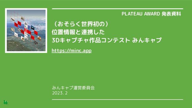 PLATEAU AWARD 発表資料 (おそらく世界初の) 位置情報と連携した 3Dキャプチャ作品コンテスト みんキャプ https://minc.app みんキャプ運営委員会 2023.