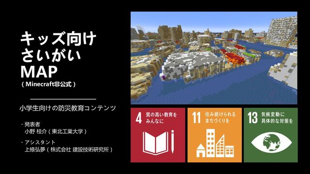 キッズ向け さいがい MAP (Minecraft非公式) 小学生向けの防災教育コンテンツ ・発表者 小野 桂介(東北工業大学) ・アシスタント 上條弘夢(株式会社