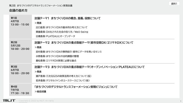 1 第1回 4月7日 13:00 - 15:00 討議テーマ1 まちづくりDXの概念、意義、役割について >発表 出口座長:まちづくりDXの基本的な考え方について 齋藤委員:DX化された社会の在り方/Well-being 古橋委員:PLATEAUとオープンデータ 第2回 5月12日 18:00 - 20:00 討議テーマ2 まちづくりDXの重点取組テーマ(都市空間DX/エリマネDX)について >発表 吉村委員:まちづくりDXの事例紹介:都市にデータを用いるセンス 水野委員:まちづくりDXの法的課題の整理 重松委員:エリマネDX実現に必要な論点 第3回 6月7日 18:00 - 20:00 討議テーマ3 まちづくりDXの重点取組テーマ(オープンイノベーション/PLATEAU)について >発表 瀬戸委員:三次元GISの政策活用の考え方について(仮) 若井委員:デジタルツインのユースケースについて(仮) 第4回 7月7日 17:30 - 19:30 「まちづくりのデジタルトランスフォーメーション実現ビジョン」について >総合討議 資料1
