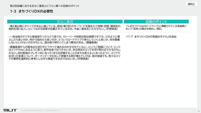 まちづくりDXの必要性 1 反映のポイント ・第2章以降にギャップがあると感じている。前回(第1回)のキーワードを踏まえて時間・空間、関係性の 制約を取り払うことにつながる政策が記載されているのか、今後ご意見をいただきたい。(宇野局長) 主なご意見 ・「4.まちづくりDXのロードマップ」に掲載されている各施策に おいて「変革」の観点を検討し、明記。 ・一自治体のデジタル推進室だったらどう思うか、ストーリーや役割分担は納得できても、どのように導 入したら良いのか、何から始めたら良いのか、どういうロードマップで参入していくと良いか、何を整備 しないといけないのかがないと、読み物で終わってしまう懸念がある。 (齋藤委員) ・齋藤委員からの理念は立派だがどうやって進めるのかが示せていない、というご指摘について、ヒント はエリマネDXにあるように思う。都市全体ではできないが、ある特定のエリアを切り取ればできるかもし れない。吉村委員のプレゼン中にあった「まちを評価することがまちを変える」にあったように、エリアで 区切った変革について、オープンデータ化をして評価する例が増えていけば、他の地域でも、色々なエリ アの事例を選択的に参考にしながら推進できるのではないか。(宇野局長) ・「1-7 まちづくりDXの取組みモデル」を追加 資料2