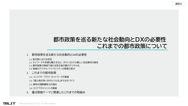 都市政策をめぐる新たな社会動向とDXの必要性 1.1 地方部における状況 - 少子高齢化 内閣府 「令和3年版高齢社会白書」 【少子高齢化】総人口は2053年に1億人を割り込み、2063年には8,808万人。全国の高齢化率は2036年に33.3%の見込 出所)内閣府 「令和3年版高齢社会白書」 (高齢化の現状と将来像) https://www8.cao.go.jp/kourei/whitepaper/w- 2021/zenbun/pdf/1s1s_01.pdf ⚫ 総人口は2020年10月1日現在1億2,571万人だが、2053年には9,924万人、 2063年には8,808万人と推計される。 ⚫ 2020年10月1日現在、日本の65歳以上人口は3,619万人となり、総人口に占める 割合は28.8%。75歳以上人口は1,872万人で14.9%。総人口の減少の中で高齢化 率(65歳以上)は上昇を続け、2036年には33.3%で3人に1人となる。2065年に は38.4%と推計されている。 図 高齢化の推移と将来推計 ※ 図: 棒グラフと実線の高齢化率については、2015年までは総務省「国勢調査」、 2020年は総務省「人口推計」(令和2年10月1日現在(平成27年国勢調査を基準とする推 計))、2025年以降は国立社会保障・人口問題研究所「日本の将来推計人口(平成29年推 計)」の出生中位・死亡中位仮定による推計結果。