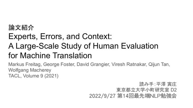 Evaluation for Machine Translation Markus Freitag, George Foster, David Grangier, Viresh Ratnakar, Qijun Tan, Wolfgang Macherey TACL, Volume 9 (2021) 読み手:平澤 寅庄 東京都立大学小町研究室 D2 2022/9/27 第14回最先端NLP勉強会