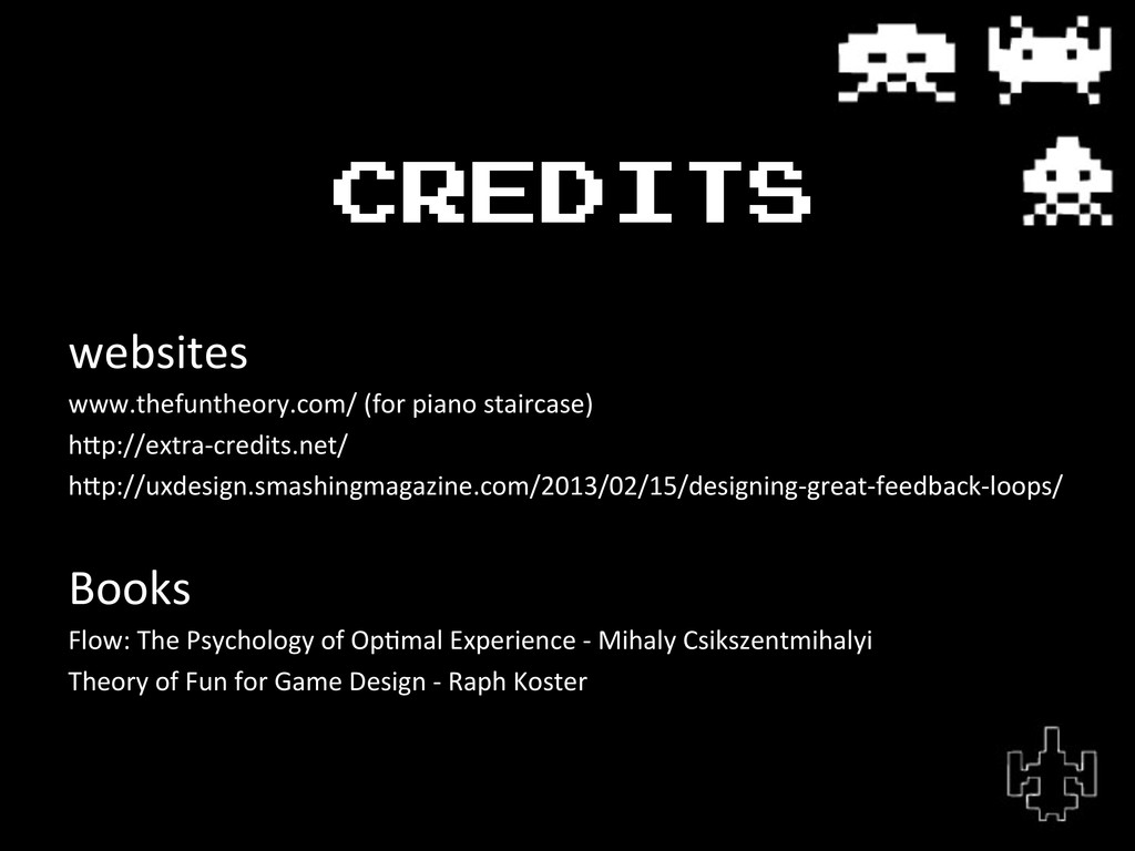 h[p://uxdesign.smashingmagazine.com/2013/02/15/designing-‐great-‐feedback-‐loops/ Books Flow: The Psychology of OpLmal Experience -‐ Mihaly Csikszentmihalyi Theory of Fun for Game Design -‐ Raph Koster
