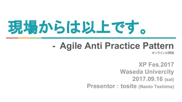 現場からは以上です。 - Agile Anti Practice Pattern オンライン公開版 XP Fes.2017 Waseda