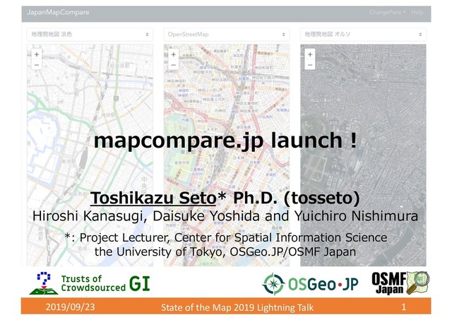 launch ! Toshikazu Seto* Ph.D. (tosseto) Hiroshi Kanasugi, Daisuke Yoshida and Yuichiro Nishimura *: Project Lecturer, Center for Spatial Information Science the University of Tokyo, OSGeo.JP/OSMF Japan