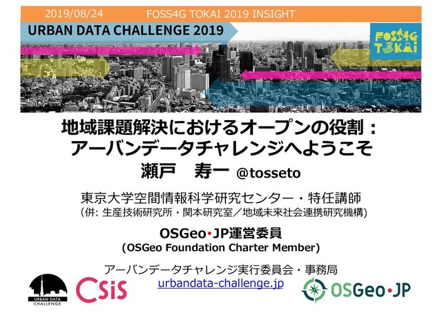 地域課題解決におけるオープンの役割︓ アーバンデータチャレンジへようこそ 瀬⼾ 寿⼀ @tosseto 東京⼤学空間情報科学研究センター・特任講師 (併: ⽣産技術研究所・関本研究室/地域未来社会連携研究機構) OSGeo・JP運営委員 (OSGeo