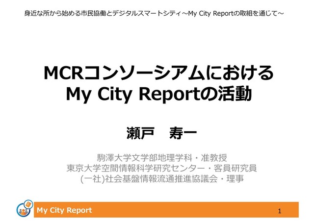 My City Report MCRコンソーシアムにおける My City Reportの活動 瀬⼾ 寿⼀ 駒澤⼤学⽂学部地理学科・准教授