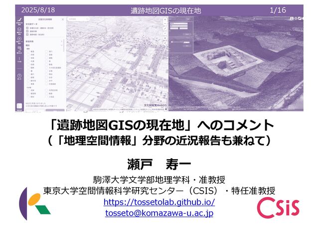 遺跡地図GISの現在地 1/16 2025/8/18 駒澤⼤学⽂学部地理学科・准教授 東京⼤学空間情報科学研究センター(CSIS)・特任准教授 https://tossetolab.github.io/
