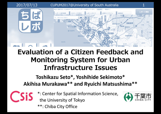 Feedback and Monitoring System for Urban Infrastructure Issues *: Center for Spatial Information Science, the University of Tokyo **: Chiba City Office Toshikazu Seto*, Yoshihide Sekimoto* Akihisa Murakawa** and Ryuichi Matsushima**