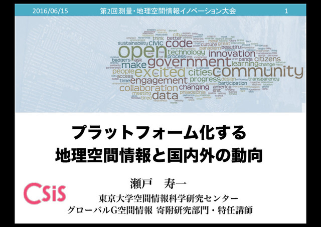 (KB) 合 計 都道府県 21 1,825 (10.0%) 309.5 3,097 (17.0%) 397.8 4,922 政令指定都市 14 836 (4.6%) 36,514.5 4,516 (24.8%) 415.5 5,352 中核市 15 705 (3.9%) 194.6 644 (3.5%) 874.8 1,349 市町村 87 1,576 (8.6%) 8615.1 4,718 (25.9%) 244.3 6,294 区部 26 96 (0.5%) 64.5 232 (1.3%) 4872.5 328 合 計 163 5,038 (27.6%) 9975.5 13,207 (72.4%) 453.9 18,245 (2015年8月末の公開時点から集計) 【位置情報ありの一例】 公共施設の場所、避難場所、AED、コミュニティバス停、観光マップ・ハザードマップ、 都市計画現況図、航空写真データ、(静岡県)森林簿、(室蘭市)地番図 など